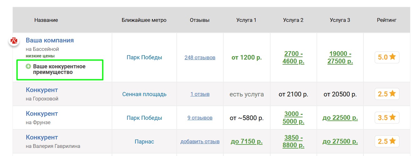 Если компания имеет конкурентные преимущества, мы можем их опубликовать на странице агентства и показывать в таблицах в соответствующих страницах. Преимущества можно гибко настраивать для разных услуг. Правильная публикация преимуществ существенно увеличивает интерес клиентов, так как выделяет агентство в таблицах и показывает, почему следует обратиться именно туда.