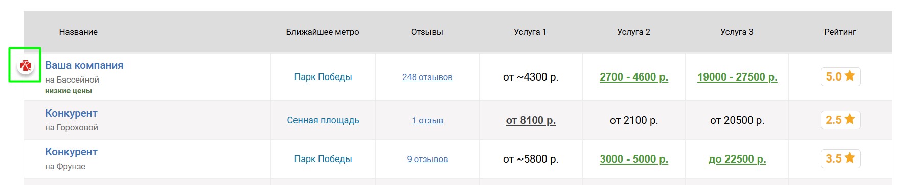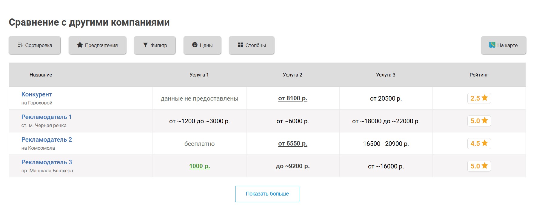 агентств, продвигаемое агентство попадёт к ним в таблицу «Сравнение по ценам», которая выглядит следующим образом: